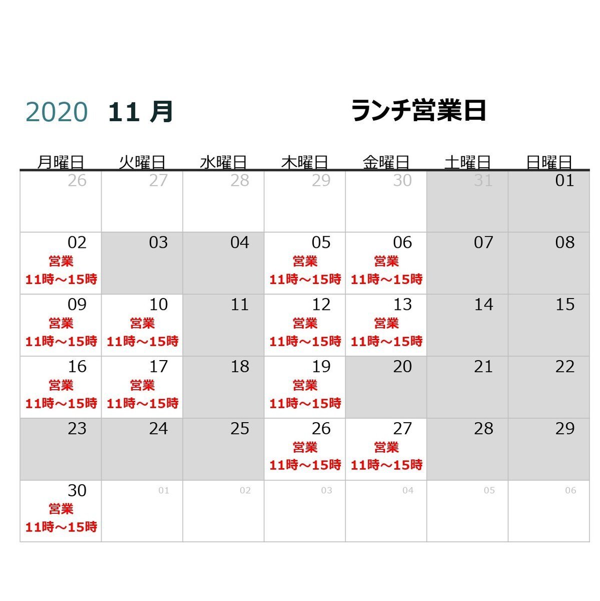11月のランチ営業カレンダーです。タイミングが合いましたら、ぜひどうぞ!!ご予約受付中!!お電話かホットペッパーからお願いします。なお、ディナー営業は水曜定休です。水曜以外はやってるよ。ただし、24日のみ臨時休業となっております。どうも川越トライシクルカフェです。