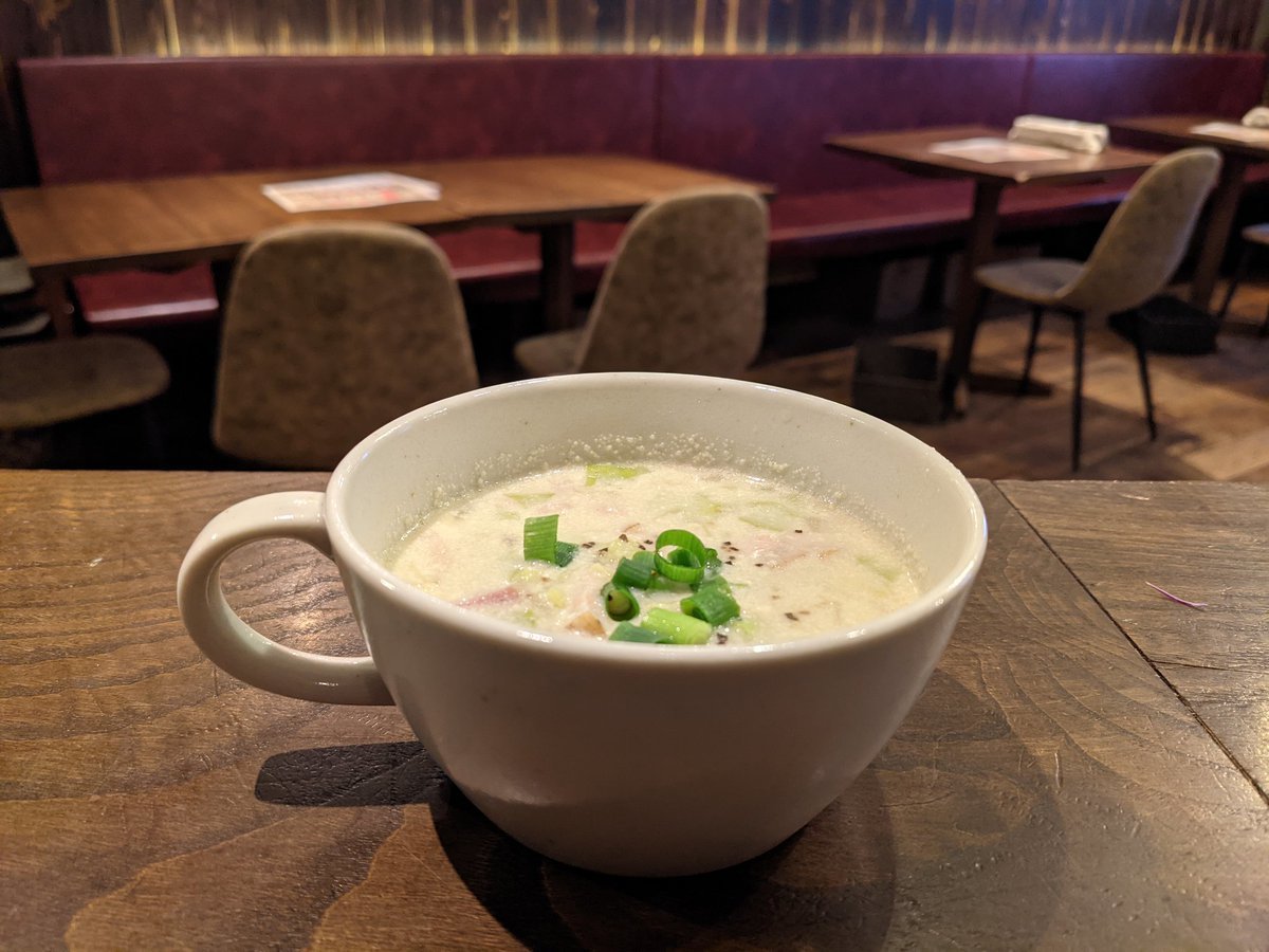 ランチ限定のスープさん。小さく切ったキャベツと玉ねぎ、ベーコンが沢山入っています。有機豆乳をベースにし、九州産の麦味噌で味付け。どうも川越トライシクルカフェです。ホッとする美味しさです。