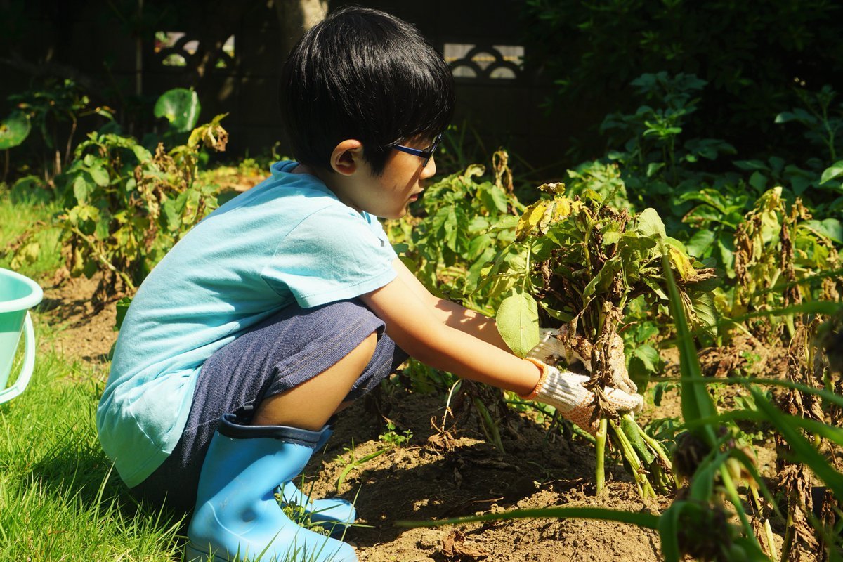 本日、4歳息子ちゃんと庭のじゃが芋(インカのめざめ)を収穫しました。あと、キュウリとニラも収穫。どうも川越トライシクルカフェです。今年のキュウリは2本だけでした。しょぼん。