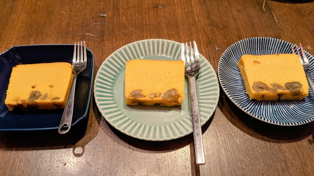 通販専用で「カボチャとマロングラッセの豆腐チーズケーキ」をリリース予定。試作の最終段階です。どうも川越トライシクルカフェです。