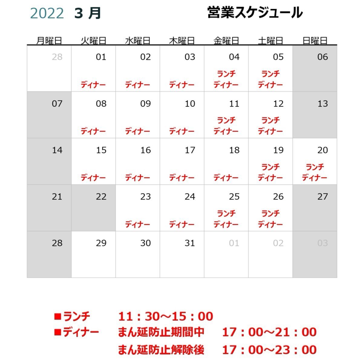 うんと、3月の営業スケジュールはこんな感じです。日曜と月曜休みですが、20日(日)は昼も夜も営業します。まん延防止が延長されたら、ご主人様の指示に従うワン。どうも川越トライシクルカフェです。