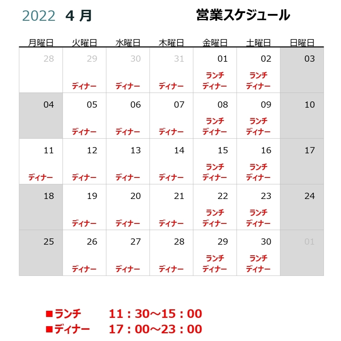 4月の営業スケジュー
