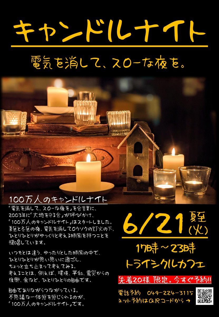 川越トライシクルカフェです。6月21日に「夏至キャンドルナイト」開催します。いつもとは違う、ゆったりとした時間の中で、ひとりひとりが思い思いに過ごし、ちょっと立ち止まって考えてみる。考えることは、例えば、環境、平和、震災からの復興、食など、ひとりひとりの自由です。そんな15の夜です。